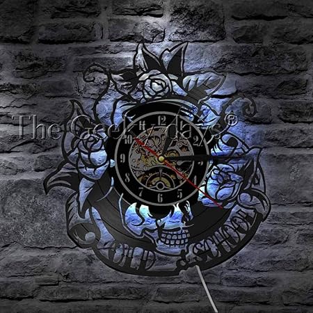Ltood Diseno De La Vieja Escuela Craneo Flores Tatuaje Vintage Vinyl Record Reloj De Pared Retro Esqueleto Arte De La Pared Decoracion Reloj Reloj Regalo Para Elwithout Led Light Amazon Es Hogar